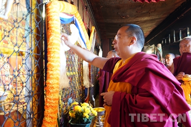 在措欽大殿,班禪虔誠叩拜供奉于此的佛祖釋迦牟尼佛像和藏傳佛教格魯派始祖宗喀巴佛像,與僧眾共同念誦經(jīng)文,之后回到寢宮拉讓殿。