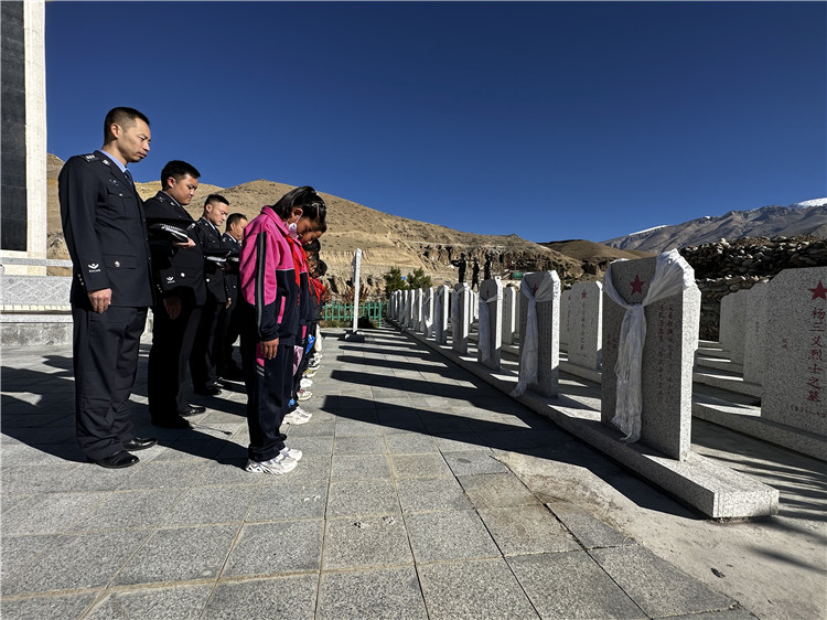 圖為參加活動的民警與學(xué)生在普蘭縣烈士陵園向英雄先烈鞠躬默哀