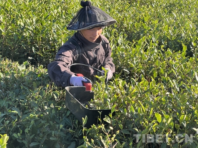 圖為格林村村民次仁正在自家的茶園里收割大茶 攝影:趙振宇
