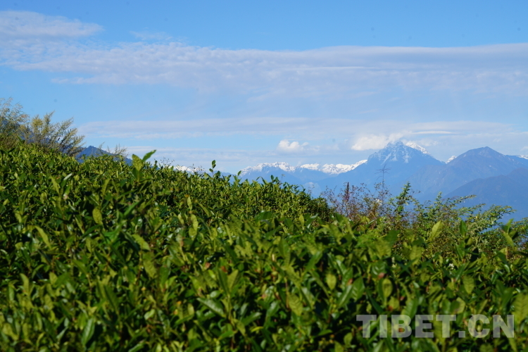 圖為在飄渺茶園內(nèi),格林村的茶園和遠(yuǎn)處的雪山形成明顯的氣候差異 攝影:德吉卓瑪