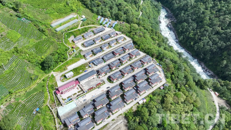 圖為搬遷后的墨脫縣背崩鄉(xiāng)巴登村全貌(航拍圖),整個村莊位于雅魯藏布江大峽谷西側(cè)的山坡上,村莊的西側(cè)是茶園。圖片由墨脫縣融媒體中心提供