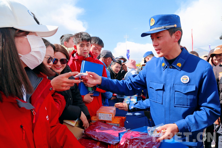 圖為啟動儀式現(xiàn)場拉薩消防指戰(zhàn)員向市民發(fā)放文創(chuàng)產(chǎn)品和宣傳資料