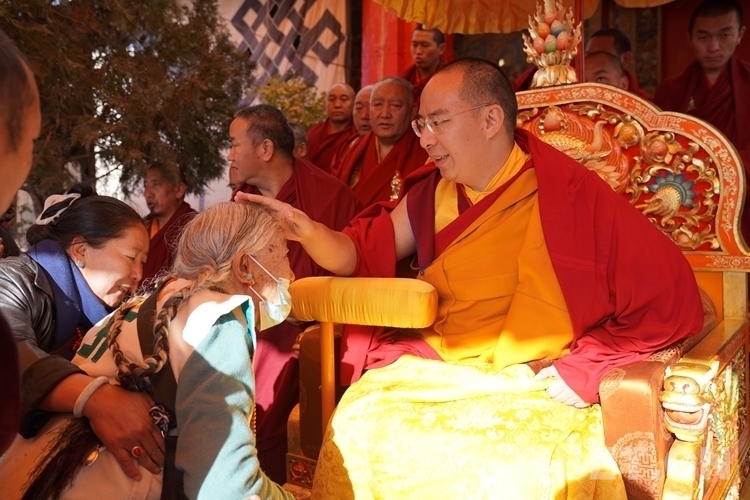 71歲的次仁曲珍老家在日喀則市拉孜縣,當(dāng)天在女兒的陪伴下拄著拐杖來到扎什倫布寺等候班禪摸頂賜福。看到老阿媽慢慢走近,班禪露出關(guān)切的神情,俯身向前,雙手接過哈達(dá)掛在老人的脖子上,輕輕為她摸頂,并祝福老人健康長(zhǎng)壽。