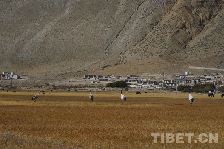 圖為定結(jié)縣田間地頭“散步”的黑頸鶴。(定結(jié)縣委宣傳部提供)