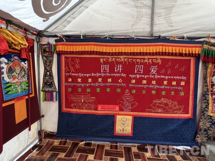 圖為夫妻二人繡制完成的雙語“四講四愛”藏繡作品。攝影:德吉卓瑪