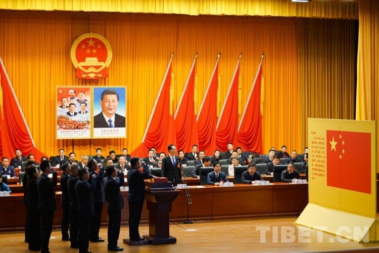 圖為拉薩市第十二屆人民代表大會(huì)第四次會(huì)議舉行的憲法宣誓儀式 攝影:趙振宇