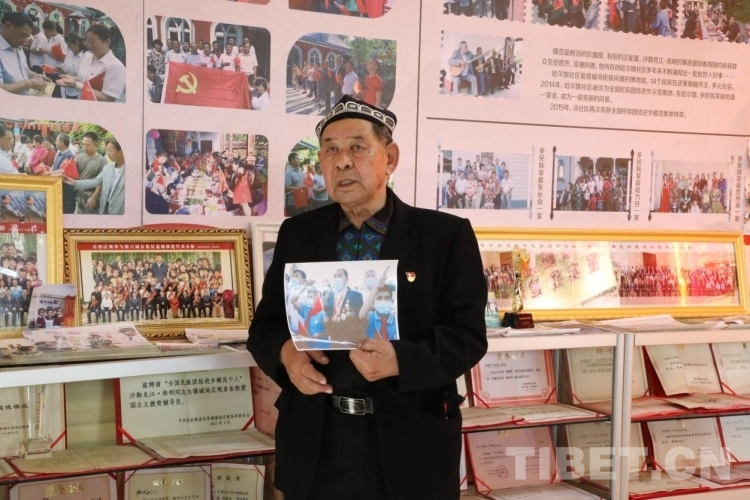 在講述故事的時(shí)候,沙勒克江·依明老人總是把腰背挺得直直的,雙眼的目光有神而堅(jiān)定,說話吐詞帶有重音和落地實(shí)感。當(dāng)他拿起照片,講起自己觀看天安門廣場的升旗儀式時(shí),他會用腳一聲一聲地踏出聲音,沉浸描述當(dāng)時(shí)國旗班的腳步聲帶給他的心靈震撼。而隨著他的動作,我們的身心也顫抖了起來。
