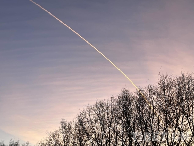 圖為飛機(jī)越過粉藍(lán)間接的日出天空 攝影:王妍丹