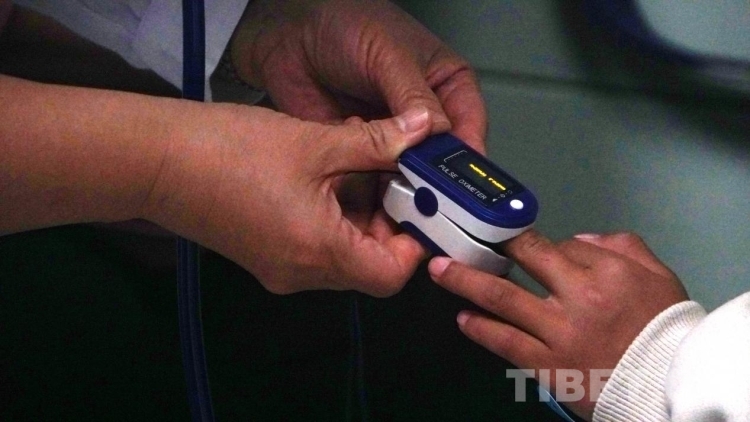 圖為醫(yī)生為果洛患兒初步檢查血氧飽和度 攝影:楊月云