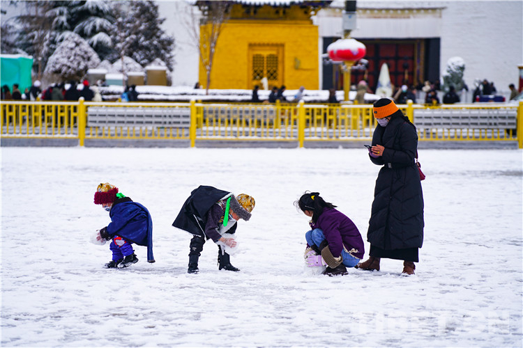 第四站,布達拉宮廣場?!敖o我一瓶礦泉水,我能還你兩座布達拉宮。”比起什么時候都可以在這里拍的布達拉宮倒影,雪中的布達拉宮廣場可謂是“可遇不可求”。南方的游客在這里激動地高喊“我終于見到雪了”,北方的游客抖抖肩膀上的雪花繼續(xù)拍攝下一組寫真,本地的藏族娃娃和小伙伴們一起追逐嬉戲,雪中的西藏和平解放紀念碑顯得更加巍峨。