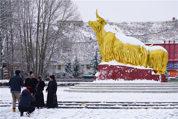 第二站,銅牛廣場。銅牛廣場位于布達拉宮西南方向約300米處,北京中路與林廓西路在此相交。這里是開放式的人行道,非常開闊,是通往布達拉宮廣場的必經(jīng)之路,很多人都在此合影留念。雪中的銅牛披上了白色的“外衣”,更加體現(xiàn)出“憨厚、忠誠、悲憫、堅韌、勇悍、盡命”的牦牛精神。