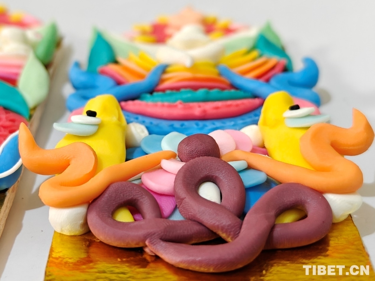 頓珠的二兒子丹增朗杰今年只有19歲,是一名高中生,但制作酥油花的手法已經(jīng)極為嫻熟。他盤腿而坐,面前擺放著調(diào)制好的各色酥油和一盆清水。只見他捏取一小塊酥油在冷水中浸泡一會(huì),然后熟練地用食指和拇指將酥油捏成不同形狀,粘貼于一塊盾形木板上,一對(duì)對(duì)色彩斑斕、寓意吉祥的酥油花作品便完成了。