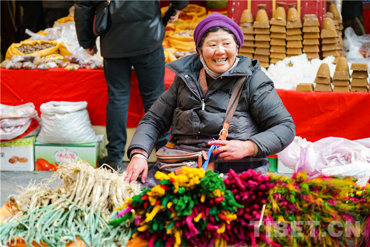 圖為正在銷售青稞苗和“洛薩美朵”的藏族阿佳 攝影:趙振宇