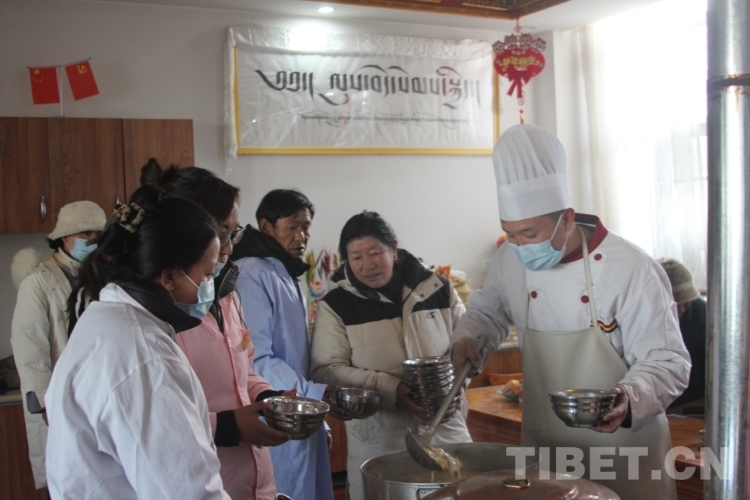 圖為工作人員正在給老人們盛面疙瘩 攝影:旦曲