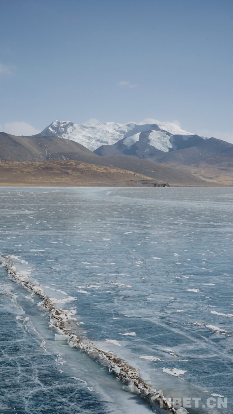 又見羊卓雍措是在冬日。與夏天不同,冬天的西藏常見大風(fēng)。云一少,羊湖的藍(lán)愈加冷冽深邃。在去普瑪江塘鄉(xiāng)采訪的途中,還路過(guò)了普莫雍錯(cuò)。與全年幾乎不結(jié)冰的羊湖不同,普莫雍錯(cuò)已經(jīng)結(jié)為通透的藍(lán)冰。湖的邊緣像是在打浪的一瞬間凍結(jié)起來(lái)的,一層一層,走在上面稍不留神就會(huì)被湖面的大風(fēng)吹倒。