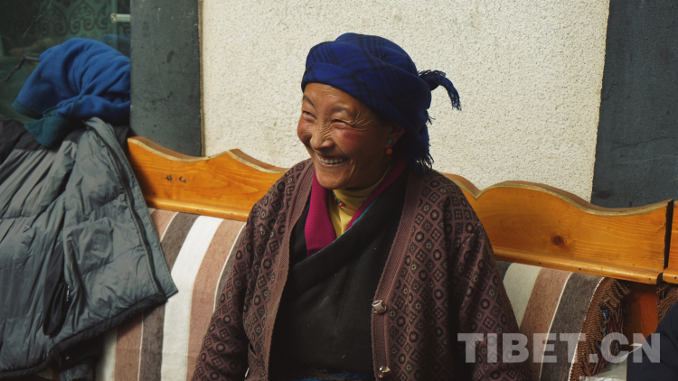 這是我最喜歡的莫啦。住在莫啦家的幾天里,除去采訪、收集素材和寫稿,最放松的時(shí)刻就是忙里偷閑和莫啦在廚房烤火、在巷子口曬太陽(yáng)。莫啦會(huì)問(wèn)我穿得這么少冷不冷,會(huì)給我講路過(guò)的小女孩有個(gè)雙胞胎姐姐,會(huì)讓我送熱水給我的同事喝,會(huì)拿盛滿卡塞和奶渣的點(diǎn)心盒塞給我吃,會(huì)在我想把手頭工作做完再吃飯時(shí)問(wèn)同事我怎么不吃飯。當(dāng)然這些我大多是聽不懂的,有些是德瓊阿佳(莫啦的女兒,拉康社區(qū)婦女主任,同時(shí)也是客棧的老板)和達(dá)次哥(這次出差的司機(jī)師傅)翻譯給我的,有些是我倆通過(guò)比劃猜到的。