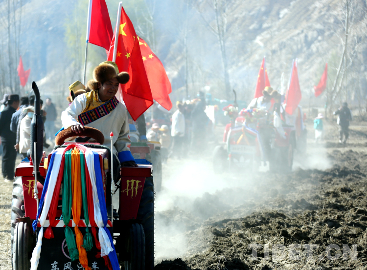 整個活動充滿儀式感。村民們先是來到田地中央燃桑香、獻貢品,祈求風調雨順、無災無害、莊稼豐收。開耕第一犁在吉祥喜慶的藏戲《扎西雪巴》表演中拉開了序幕,一輛輛插著五星紅旗,用五彩哈達、花朵、吉祥圖案裝扮一新的拖拉機一字排開,涌向待墾的農田進行翻耕,播撒第一粒種子。