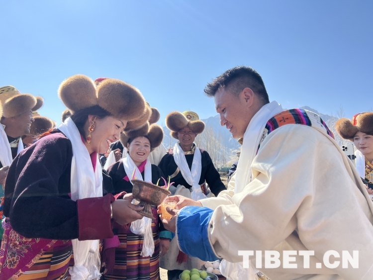 開耕儀式結束后,茶巴朗村藏戲隊成員們?yōu)樵缫褤Q好藏裝過來體驗西藏民俗文化的游客們獻哈達、敬青稞酒、唱敬酒歌,游客們現(xiàn)場學起“三口一杯”與當?shù)厝斯捕冗@美好的一天。西藏卓美旅行社負責人孫赫男介紹說:“西藏除了山水美景之外,春耕儀式也是非常具有當?shù)靥厣奈幕?,能給人留下深刻記憶。今天,我?guī)е鴣碜员鄙蠌V等全國各地的游客來這里體驗春耕儀式,讓大家看看西藏當?shù)氐娜罕娛窃鯓娱_始春天的。游客們穿著藏裝,免費品嘗青稞酒、酥油茶、牛肉、藏雞蛋等各種農產品,還和充滿熱情的當?shù)卮迕駛兓?,他們玩得非常開心?!?nbsp;