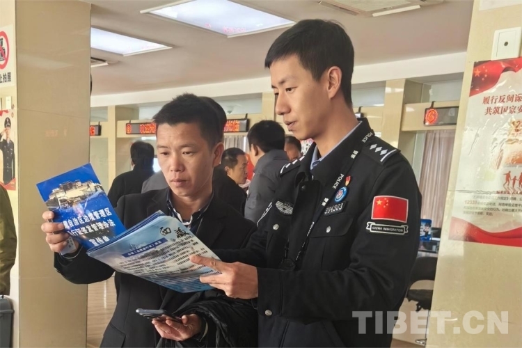 圖為西藏邊檢總站執(zhí)法調查支隊辦證室民警在西藏拉薩向群眾普及邊境管理區(qū)通行證管理辦法