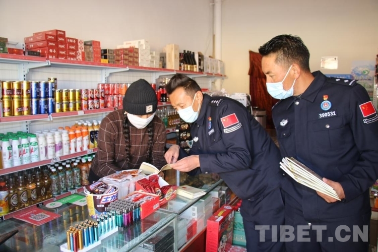 圖為西藏邊檢總站執(zhí)法調查支隊民警在西藏日喀則市定日縣商鋪宣傳國家安全知識