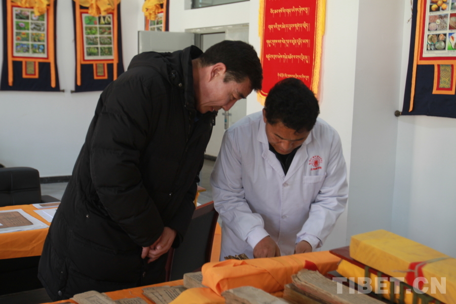 圖為尼偉藏醫(yī)康復(fù)醫(yī)院負(fù)責(zé)人布地(右)向中國西藏網(wǎng)記者介紹古籍 攝影:登真巴珍