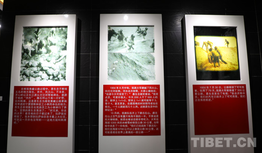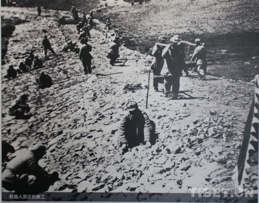 圖為青藏公路紀(jì)念館中展出圖片:筑路人員正在施工 翻拍:王茜