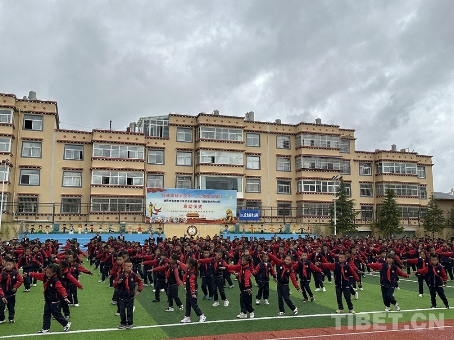 正在大課間休息的同學(xué)們,在老師的帶領(lǐng)下紛紛涌向操場(chǎng),伴隨著歡快的舞曲跳起了藏族鍋莊;合唱團(tuán)的孩子們唱起了該校自主編創(chuàng)的社會(huì)主義核心價(jià)值觀24字童謠,孩子們挺拔的身姿和鏗鏘的歌聲,盡顯文化自信和民族自豪感。