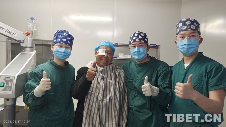 圖為患者拉巴對為自己實施眼科手術(shù)的醫(yī)生豎起大拇指