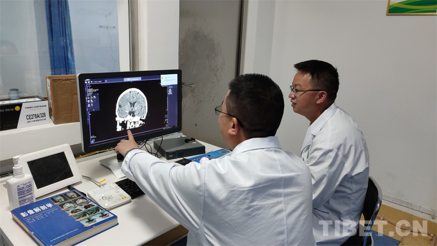 圖為醫(yī)療隊(duì)隊(duì)員對腦梗患者的顱腦CT進(jìn)行閱片