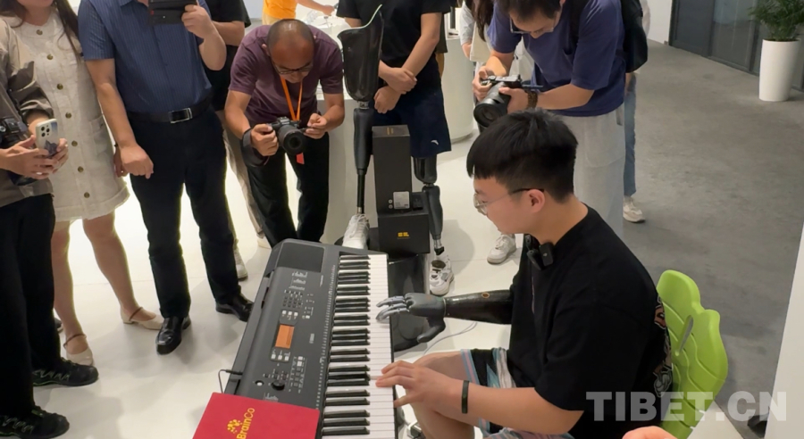 圖為BrainCo強(qiáng)腦科技產(chǎn)品體驗官周鍵在彈鋼琴