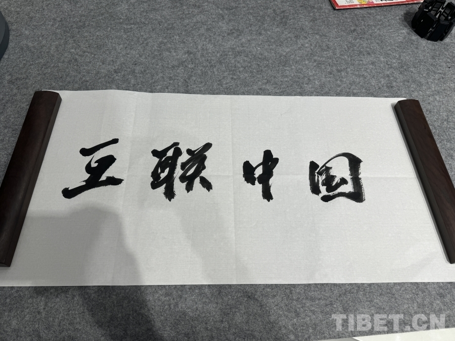 圖為BrainCo強(qiáng)腦科技產(chǎn)品體驗官倪敏成用毛筆字寫的“互聯(lián)中國”四字