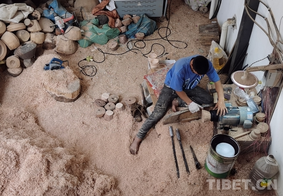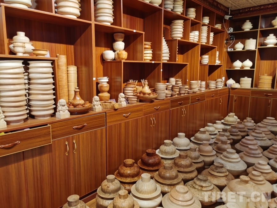 我們首先來到的是四川省非物質文化遺產項目——藏族民間車模技藝體驗基地?;匾粚邮枪ぷ鲄^(qū),一位師傅正在全身心制作木質生活用具,絲毫沒有察覺我們的到來。于是沒有過多打擾,我們徑直來到二樓展品陳列區(qū)。藏族民間車模技藝傳承人格絨次仁的兒子洛絨次仁拿起一個木碗,臉上露出樸實而靦腆的微笑介紹道,“這些都是選用樹瘤制作而成,一般選用鵝掌木、杜鵑等15類樹木,因為直木容易裂開。為了用具不裂開,處理后的樹瘤煮水后需晾干五至六個月,一個木碗制作工序可能要長達半年才能完成。此項技藝在家族傳承至今已有四代,我們要做就做好一點?!甭褰q次仁大哥希望更多人能了解這項非物質文化遺產,有更多人愿意來傳承學習這份技藝,有更多人喜歡他們制作的這些木質生活用具。