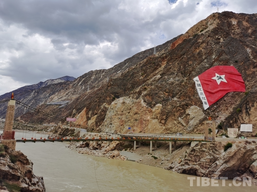 圖為中國工農紅軍巖旗和橫跨金沙江的賀龍橋 攝影:鄒慧