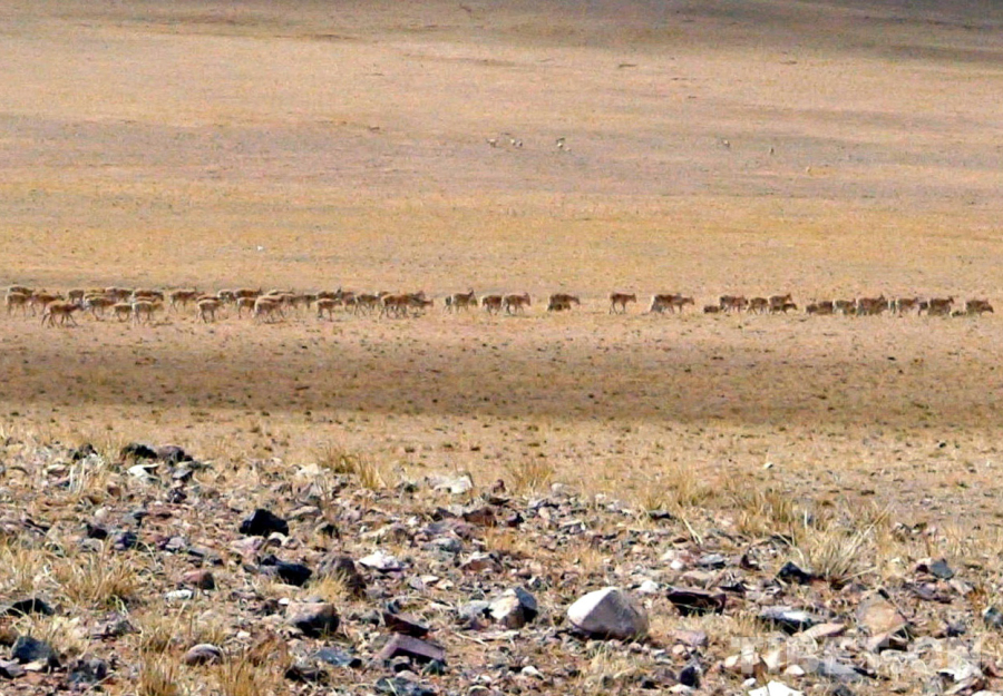 圖為羌塘國家級自然保護(hù)區(qū)正在遷徙產(chǎn)羔的成群藏羚羊(唐召明2006年攝)