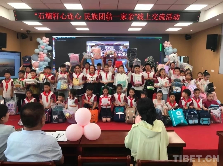 圖為安徽明光市明湖學(xué)校與西藏浪卡子縣打隆鎮(zhèn)小學(xué)開展“石榴籽心連心民族團(tuán)結(jié)一家親”線上交流活動(dòng)