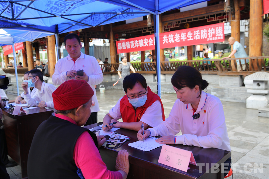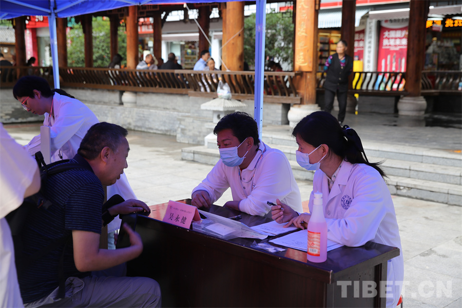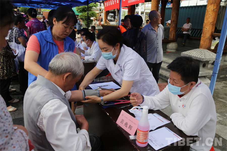 圖為瀘定橋廣場(chǎng)義診點(diǎn),專家正在為患者量血壓 攝影:登真巴珍