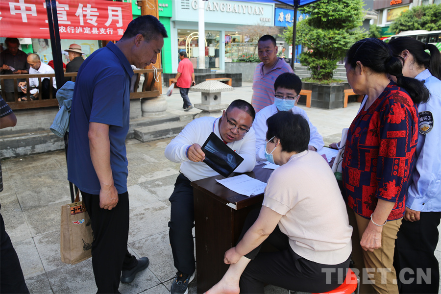圖為瀘定橋廣場(chǎng)義診點(diǎn),骨科專家正在為患者診治 攝影:登真巴珍