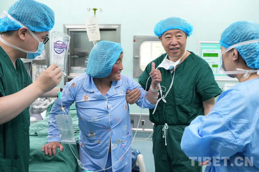 圖為手術(shù)室內(nèi),剛剛完成局部麻醉微創(chuàng)椎管擴大減壓手術(shù)的藏族患者穆女士在張西峰(左三)的指導(dǎo)下成功站立,并為張教授的精湛醫(yī)術(shù)點贊。