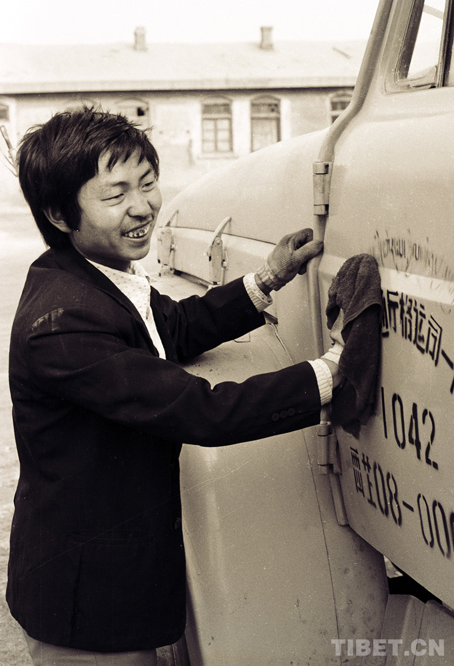 西藏交通廳格爾木汽車運輸公司一隊汽車駕駛員楊忠禮在擦拭汽車。(唐召明1987年攝)