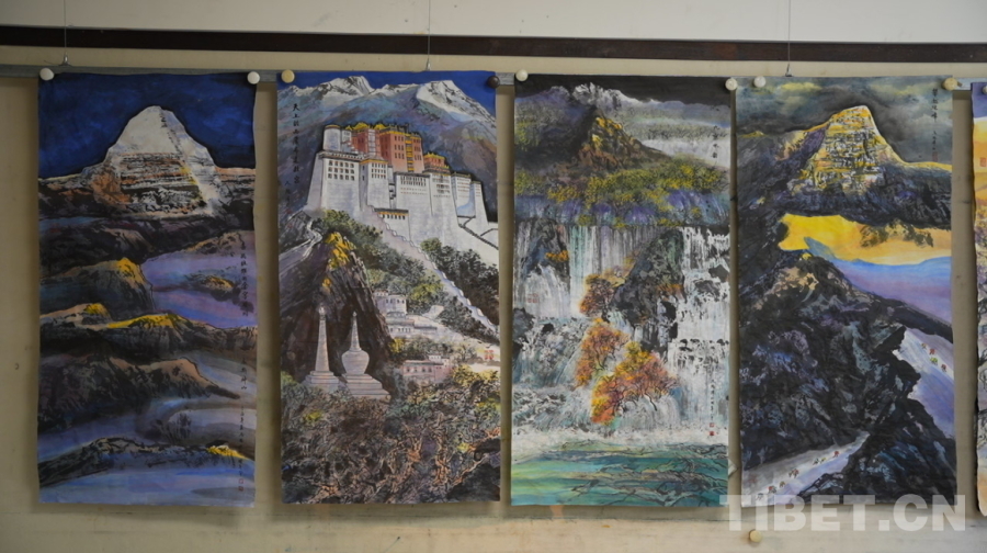 圖為尼瑪澤仁即將帶往法國的四幅展覽畫作,從左到右分別是《喜馬拉雅的金字塔岡底斯神山》《天上的西藏布達(dá)拉宮》《九寨水韻》《攀越珠峰》 攝影:陳浩力