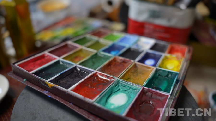 圖為尼瑪澤仁繪畫時使用的顏料盤 攝影:陳浩力