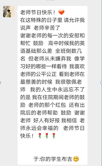上大學(xué)時(shí),?我?guī)е鴱哪抢飳W(xué)到的堅(jiān)韌和自信,?踏入了這個(gè)全新的世界。?雖然大學(xué)生活與高中截然不同,?挑戰(zhàn)也更多,?但我始終記得您的教誨,?知道只要努力,?就沒有什么是不可能的。??每當(dāng)遇到困難,?我都會(huì)告訴自己,?就像您曾經(jīng)幫助我克服英語難題一樣,?我也能在這里找到屬于自己的路,于是更加堅(jiān)定了前進(jìn)的決心。?