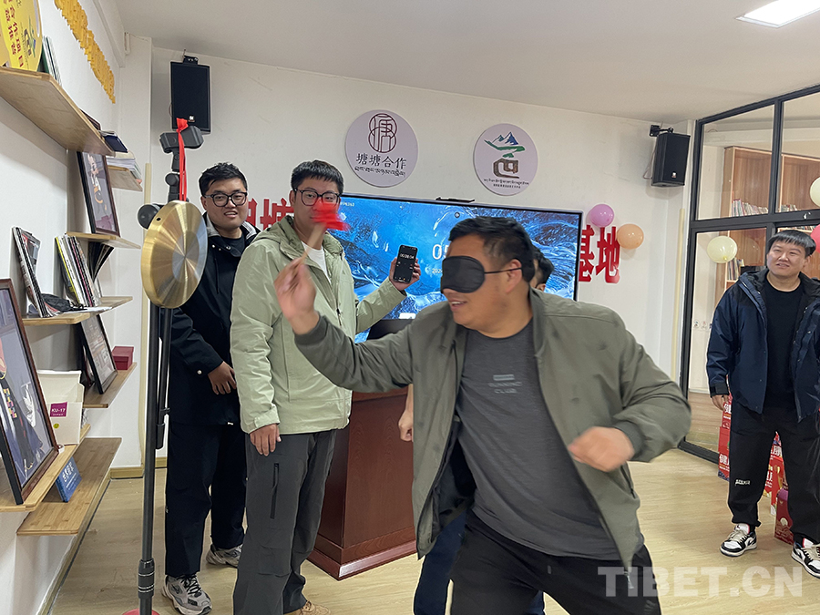 猜燈謎、投壺、蒙眼敲鑼等活動相繼舉行,現(xiàn)場熱鬧非凡。投壺是中國古代一種博弈助興的游藝,專技人才們參與積極性極高,紛紛尋找角度,穩(wěn)住心態(tài),瞄準(zhǔn)壺口投射,投中者贏得陣陣掌聲;蒙眼敲鑼的環(huán)節(jié)將本次活動推向了高潮,大家自由結(jié)對,接力在蒙住雙眼的條件下,僅憑借隊友的引導(dǎo)敲響銅鑼。