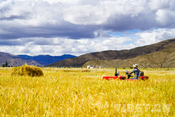 圖為正在青稞田里駕駛農具的歐珠 攝影:王淑