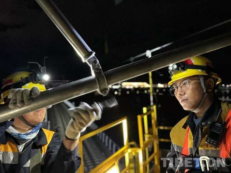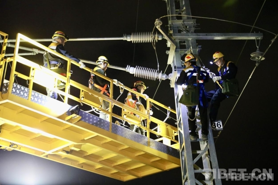 23時(shí)00分,軌道車穩(wěn)穩(wěn)???,“天窗”作業(yè)命令下達(dá)。中國鐵路青藏集團(tuán)有限公司拉薩基礎(chǔ)設(shè)施段供電維修技術(shù)中心拉薩南接觸網(wǎng)維修隊(duì)工長李積王帶著7名工友走下接觸網(wǎng)作業(yè)車,驗(yàn)電、連接地線端、接掛地線……一系列操作一氣呵成。隨即,現(xiàn)場負(fù)責(zé)人拉加和工友們依次登上距離地面6米高的作業(yè)平臺上,穿梭于接觸網(wǎng)線索之間,猶如凌空“舞者”。