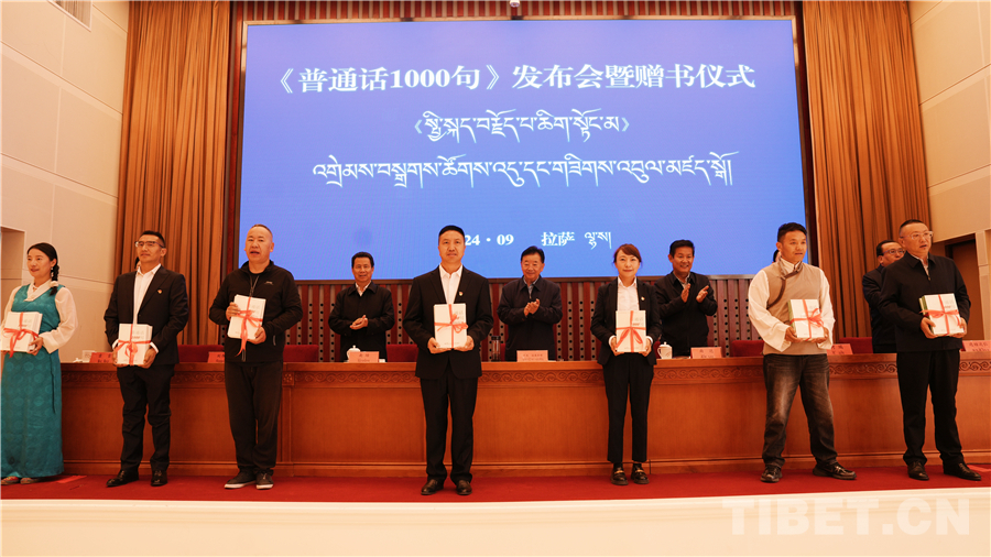 中國西藏網(wǎng)訊 為進一步助力國家通用語言文字推廣普及,鑄牢中華民族共同體意識。9月20日,西藏自治區(qū)藏語委辦(編譯局)在拉薩舉行了《普通話1000句》漢藏對照版新書發(fā)布會暨贈書儀式。西藏自治區(qū)政府副主席、自治區(qū)藏語委副主任甲熱·洛桑丹增出席會議,西藏自治區(qū)藏語委辦(編譯局)黨組副書記、主任(局長)達娃次仁作新書出版介紹,會上宣讀了教育部語文出版社發(fā)來的賀信,并向與會代表贈書。