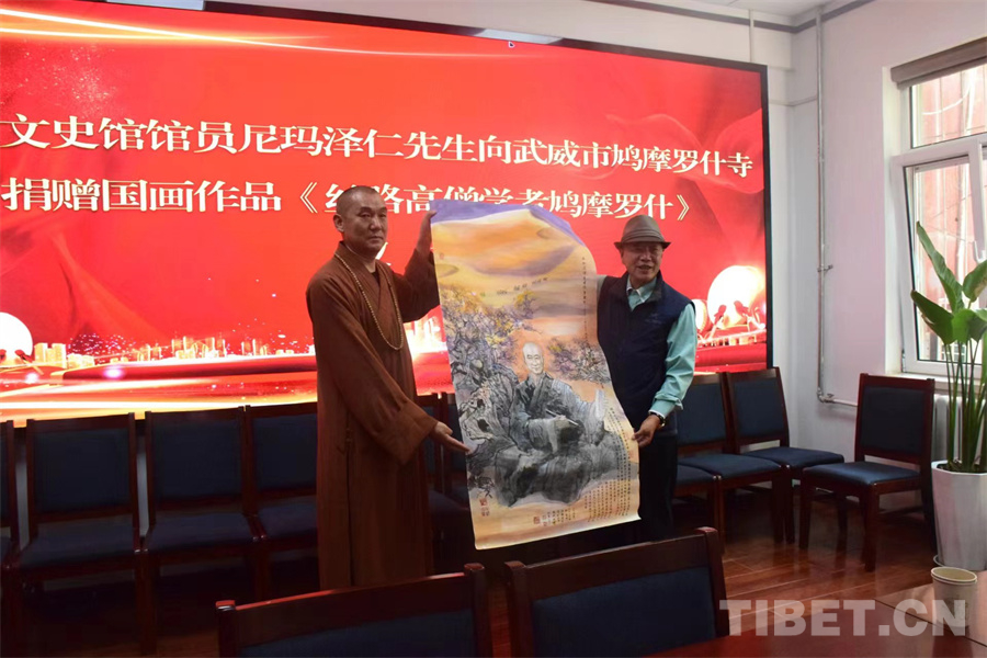 據(jù)悉,尼瑪澤仁在此前已將精心創(chuàng)作的《元蕃瑞和圖》捐贈給甘肅省武威市涼州會盟紀(jì)念館,此次又將創(chuàng)作的《絲路高僧學(xué)者鳩摩羅什》繪畫精品捐贈給武威市鳩摩羅什寺。尼瑪澤仁表示,鳩摩羅什翻譯許多佛法經(jīng)典,促進(jìn)絲綢之路上的文化交流,作為畫家,我想紀(jì)念他的偉大貢獻(xiàn),于是創(chuàng)作了這幅繪畫送給鳩摩羅什寺。