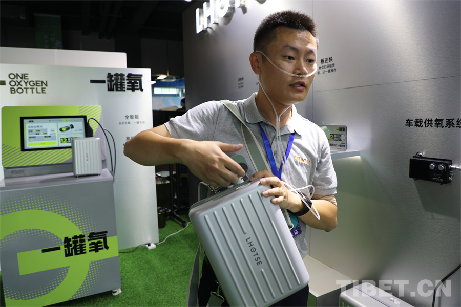 圖為318自駕游全國(guó)裝備展銷會(huì)上的工作人員正在講解如何使用高原上的氧氣背包 攝影:王妍丹