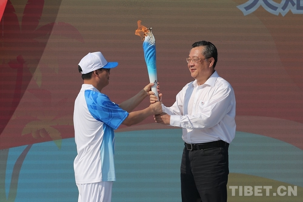 圖為國(guó)家民委副主任郭衛(wèi)平(右)將火炬?zhèn)鹘o第一棒火炬手徐洪周 攝影:民族畫(huà)報(bào) 滕俊 趙利