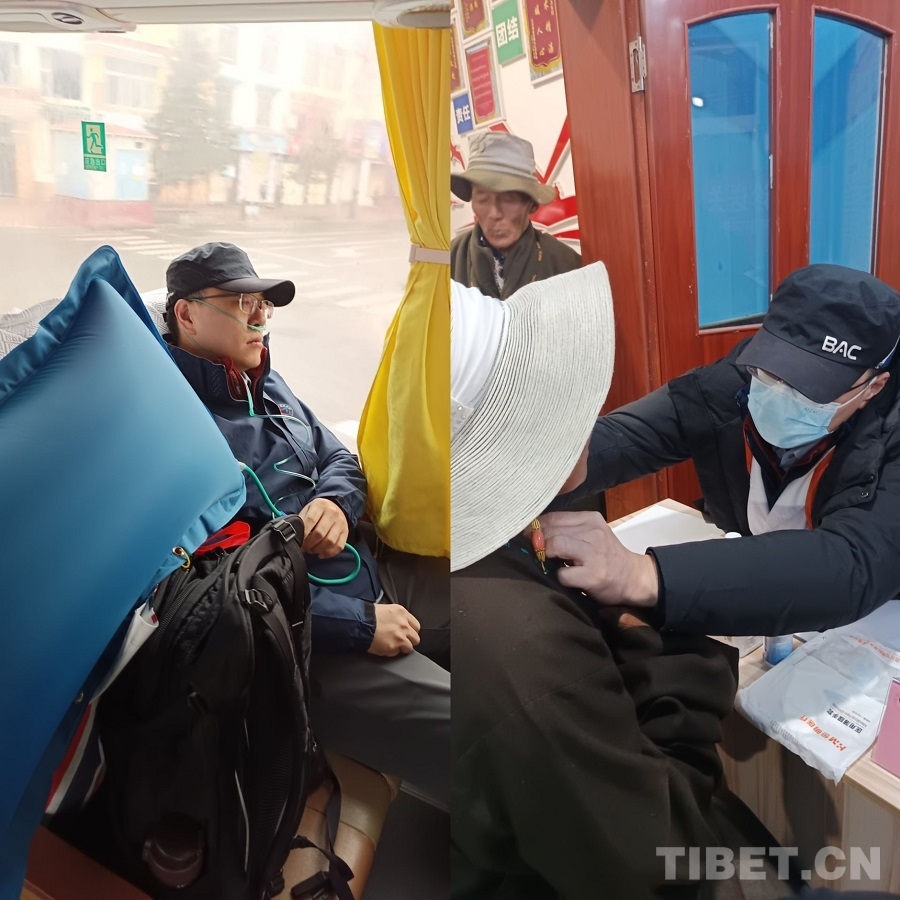 圖為前一晚抵達紅原時發(fā)燒38度的航天總醫(yī)院普外科專家蘇超云帶病前去義診(左),為當(dāng)?shù)厝罕娍丛\(右)攝影:賈春玲